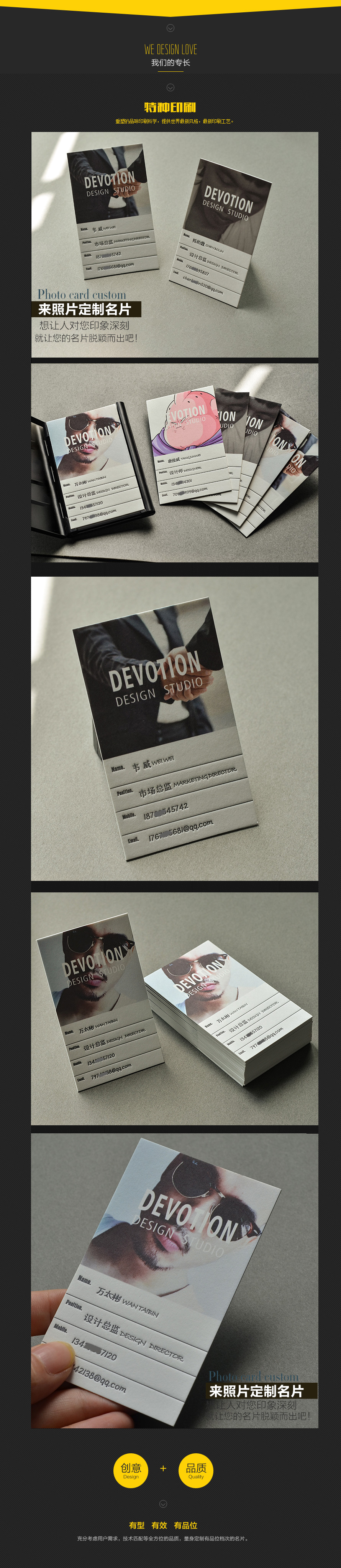 印象中大多数名片以文字为主,而我们要做的是发掘名片的与众不同,做到文字与图片相结合同时保持品质例如图像的清晰度、 文字与图片的排列,而我们这款名片不仅兼具以上两个特点,更是采用了高端棉纸,以文字做有色压凹工艺把名片的美感以及质感 大大的提升了,我们用实力说明美观与实用性二者可以兼得。