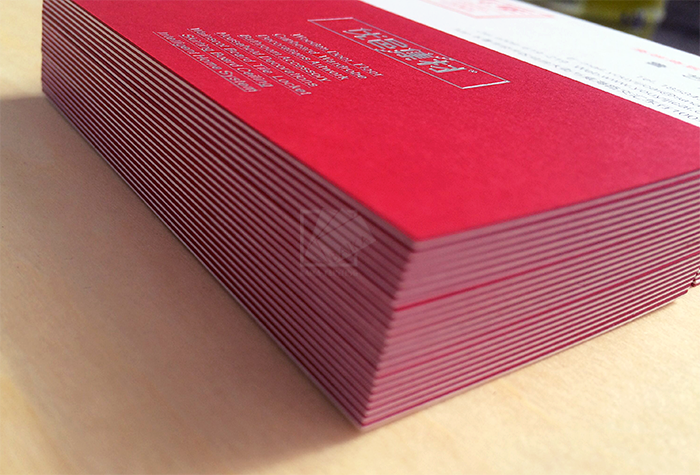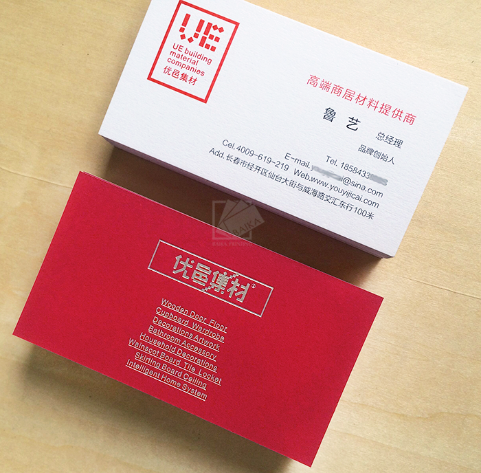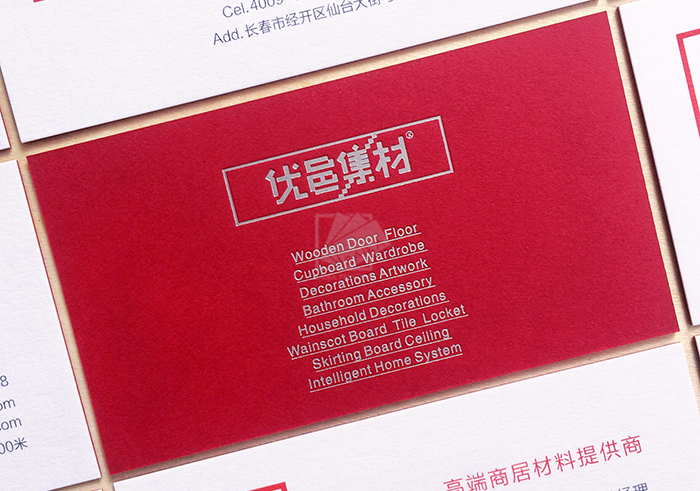 350G云素+350红卡 双层卡+印刷+烫亚银 红白双层卡,使名片颜色不单调。 红色特种纸烫亚银,纸张质感完美呈现,提升名片品位; 红色代表吉祥,喻意公司蓬勃发展。